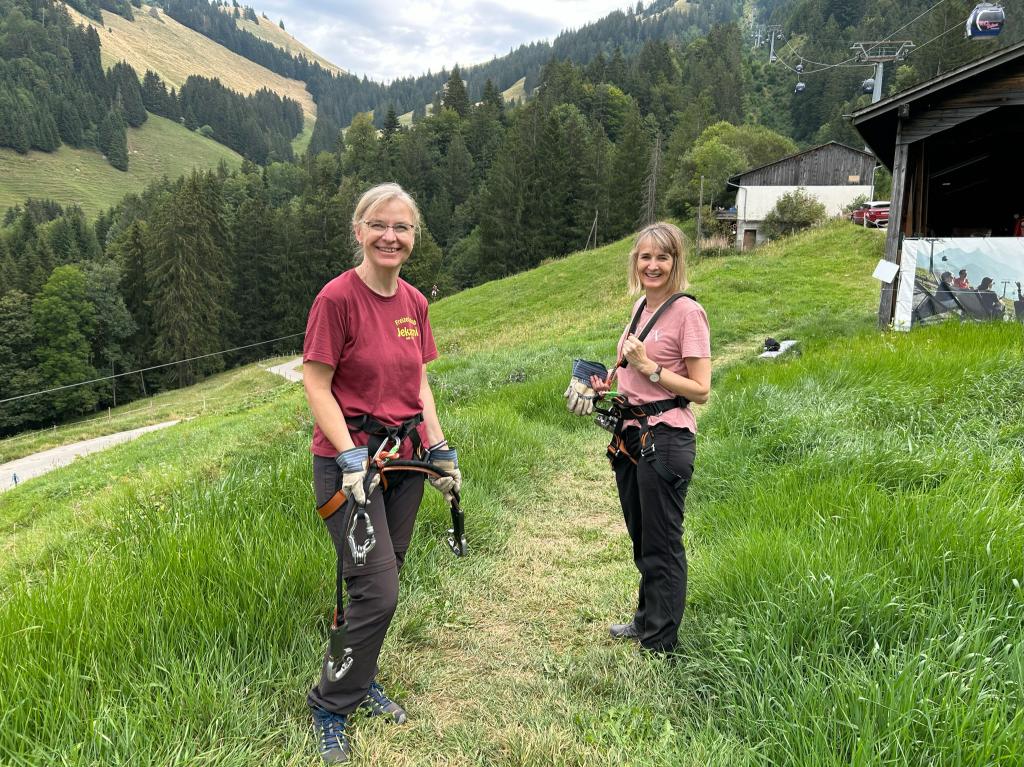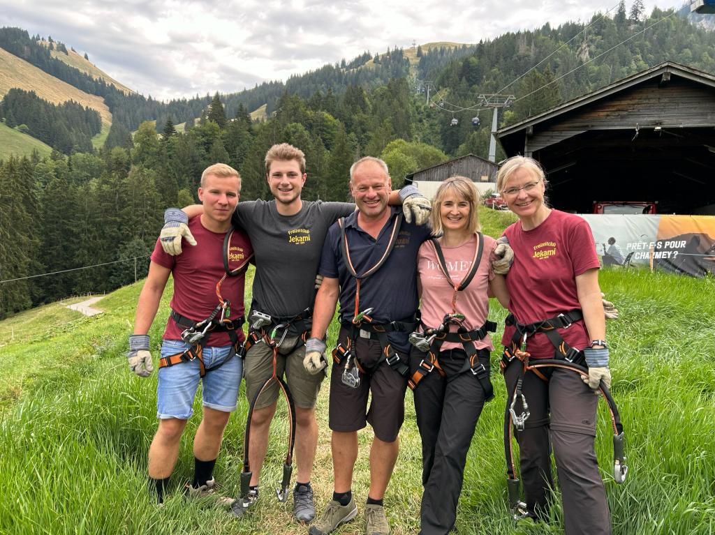 Am letzten Augustweekend fand wieder unser traditioneller Clubausflug statt. Dieses Jahr waren wir als Belohnung für den erhöhten Arbeitsaufwand wegen des Dorffestes 3 Tage unterwegs Am Freitagmorgen konnte der Car pünktlich in Richtung Westschweiz losfahren, der erste Halt war in Charmey. Wir mussten und vorab für eine Richtung des Programms anmelden. Die actionreiche Gruppe verbrachte den Vormittag im Kletterpark, am Ende wagten sich einige sogar auf den schwersten Parcours. Eine weitere Gruppe ging auf Schatzsuche, mittels einer Karte, einem Kompass und einem Fernglas konnten sie immer weitere Hinweise auf den Schatz finden. Als erstes wurde dieser von der Gruppe mit Mia und Naya gefunden. Die dritte Gruppe verbrachte den Vormittag auf einem gemütlichen Spaziergang mit schöner Aussicht, dass diese Gruppe die gefährlichste war, hätte wohl niemand gedacht. Leider sind 3 Mitglieder gestürzt, ernsthaft verletzt wurde zum Glück niemand. Nach einem gemeinsamen Mittagessen ging es mit dem Trotti, zu Fuss oder mit der Gondel wieder runter ins Tal.