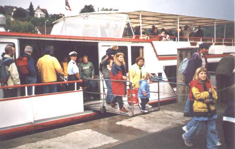 Die 2. Schrecksekunde erlebte Andrea kurz vor dem Anlegen in Diessenhofen. Auf einmal begann sich das Dach des Schiffs zu senken, und zwar so tief, das man sitzend gerade noch nicht den Kopf anschlug. Andrea wollte sich mit den Kindern schon unter den Tisch verkriechen, doch nach gutem Zureden von Vreni war die Welt wieder in Ordnung. Der Grund für das Absenken war die alte Holzbrücke in Diessenhofen, wie sich nachher herausstellte.