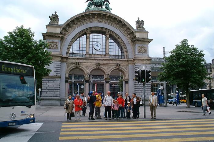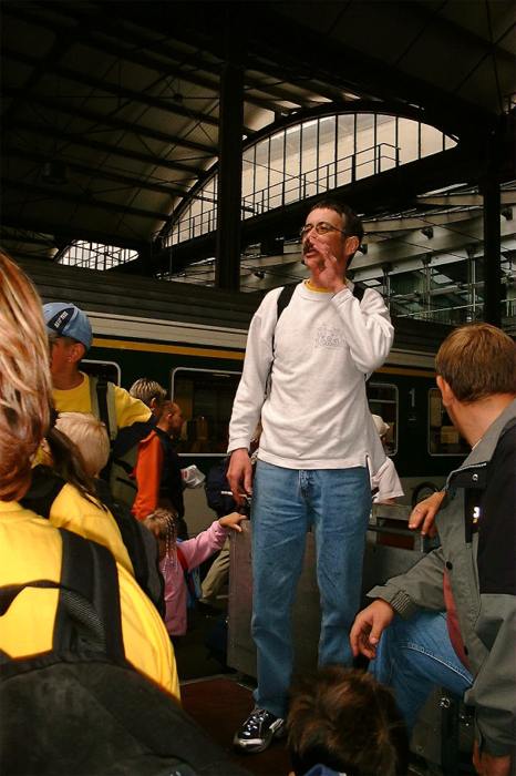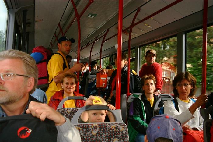Von Oberglatt ging es nach Zürich. Dort erwartete uns der Stress pur: Mit dreizehn Kindern und dem Gepäck durch den ganzen HB zum Gleis 54, ob das zu schaffen ist? - Ja, pünktlich auf die Sekunde waren alle im Zug und machten es sich bequem. Im Zug wurden wir schon sehnsüchtig von Otti und Heidi erwartet. Nach einiger Zeit beehrte uns der Billetkontrolleur mit seiner Anwesenheit. Natürlich hatten wir ein Kollektiv, dass Thommy ihm gleich unter die Nase hielt.