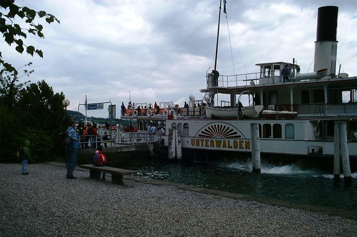In Luzern hiess es dann ins Schiff umsteigen, das nach Hergiswil fuhr. Auf dem Schiff wehte der Wind und die kleinen und grossen Kinder fanden Gefallen an den Möwen, die nebenher flogen. In Hergiswil angekommen, ging es in die Glashütte, aber vorher wurden noch die leckeren Fleischli - Sandwiches gegessen.