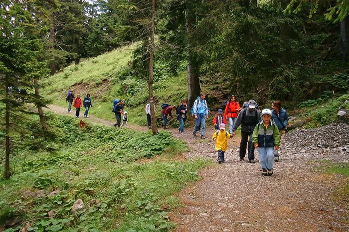 Nach der spektakulären Seilbahnfahrt begann der dreissig minütige „Marsch“ auf den schon alle warteten. Wir wanderten zum Gasthaus Fräkmünt - Alp. Nach dem Abladen des Gepäckes, ging’s ab auf die Rodelbahn, auf der wir eine Stunde lang nach Herzenslust rodeln durften. Das Rodeln war auch nicht ganz ungefährlich, gäll Hansruedi...!