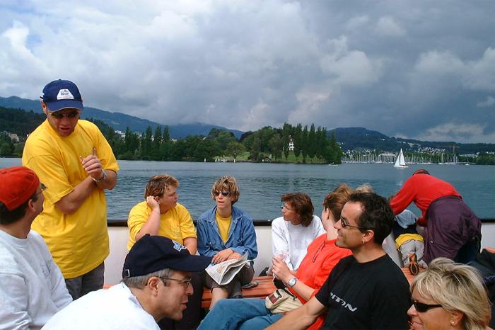 Von Oberglatt ging es nach Zürich. Dort erwartete uns der Stress pur: Mit dreizehn Kindern und dem Gepäck durch den ganzen HB zum Gleis 54, ob das zu schaffen ist? - Ja, pünktlich auf die Sekunde waren alle im Zug und machten es sich bequem. Im Zug wurden wir schon sehnsüchtig von Otti und Heidi erwartet. Nach einiger Zeit beehrte uns der Billetkontrolleur mit seiner Anwesenheit. Natürlich hatten wir ein Kollektiv, dass Thommy ihm gleich unter die Nase hielt.
