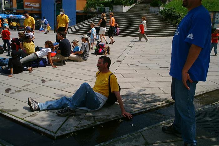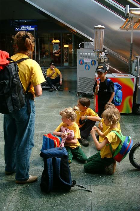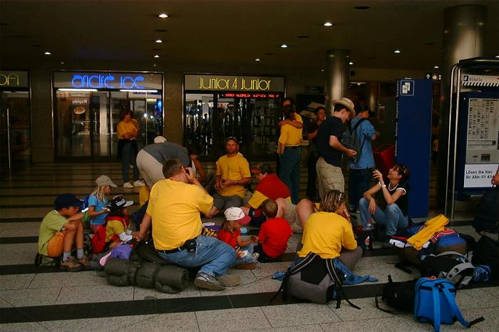 Von Oberglatt ging es nach Zürich. Dort erwartete uns der Stress pur: Mit dreizehn Kindern und dem Gepäck durch den ganzen HB zum Gleis 54, ob das zu schaffen ist? - Ja, pünktlich auf die Sekunde waren alle im Zug und machten es sich bequem. Im Zug wurden wir schon sehnsüchtig von Otti und Heidi erwartet. Nach einiger Zeit beehrte uns der Billetkontrolleur mit seiner Anwesenheit. Natürlich hatten wir ein Kollektiv, dass Thommy ihm gleich unter die Nase hielt.