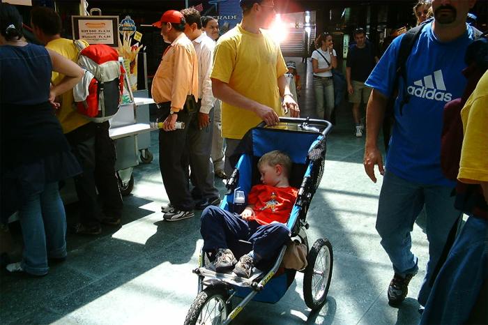 Der Hof der Familie Volkart füllt sich mit Personen, die auffällig gelbe T-Shirts tragen. Es sind die Jekamiler, die zusammen auf die Reise gehen. In der Scheune stehen Tische mit Kaffee, Orangensaft und Gipfeli, für eine Stärkung vor dem „Marsch“. Man hörte immer wieder die Frage:,, Was wetsch für es Sandwich? Es hät Chäs, Fleischchäs, Schinke und Salami“, es waren Mütter die mit Ihren Kindern ein Sandwich für den Lunch aussuchten. Nachdem sich alle auch noch ein Getränk geschnappt hatten und der Rucksack der Familie Jud wieder einigermassen trocken war, brachen wir auf. An der Nöschikoner Bushaltestelle wurden die Billete verteilt und auf den Bus gewartet, der uns nach Oberglatt brachte.